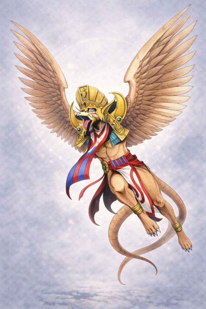 インド神話においては、ヴィシュヌ神を乗せる聖なる鳥として知られています。白い顔と黄金の身体を持つ人型に、鷲の頭と嘴、赤い翼と鋭い爪を備えた姿で描かれ、その威容は天空を支配する存在にふさわしいものです。ブラフマーの系譜に連なるカシュヤパ仙とヴィナターの子として生まれたとされています。しかしその誕生の背景には、母ヴィナターの苦難がありました。兄アルナの呪いや、ナーガの母カドルーとの賭けに敗れたことにより、ヴィナターはナーガたちの奴隷とされてしまいます。母を解放するためには、神々の住む天界から不死の霊薬アムリタを持ち帰る必要がありました。