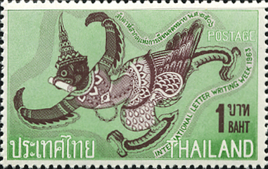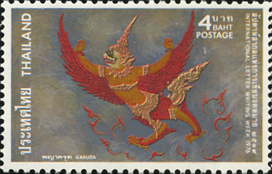 Garuda remains an important symbol in Southeast Asia. In Thailand, he is adopted as the national emblem and is frequently depicted on stamps, representing both mythological power and cultural identity.