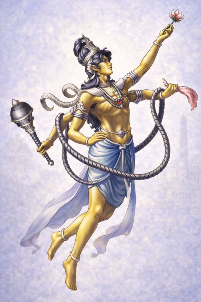 ゲームでは、多腕と神具を備えた神聖な姿で描かれ、静謐さと絶対的な力を併せ持つ存在として表現されています。浮遊する姿や宝珠は宇宙的存在としての超越性を象徴し、秩序を司る神格としての威厳を示しています。