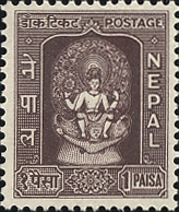 このネパール切手は、ヴィシュヌを多腕の宇宙相として表された姿で、万物を内包する存在であることを示しています。このような表現は、ヴィシュヌが宇宙そのものを体現する神であるという思想を視覚化したものです。
