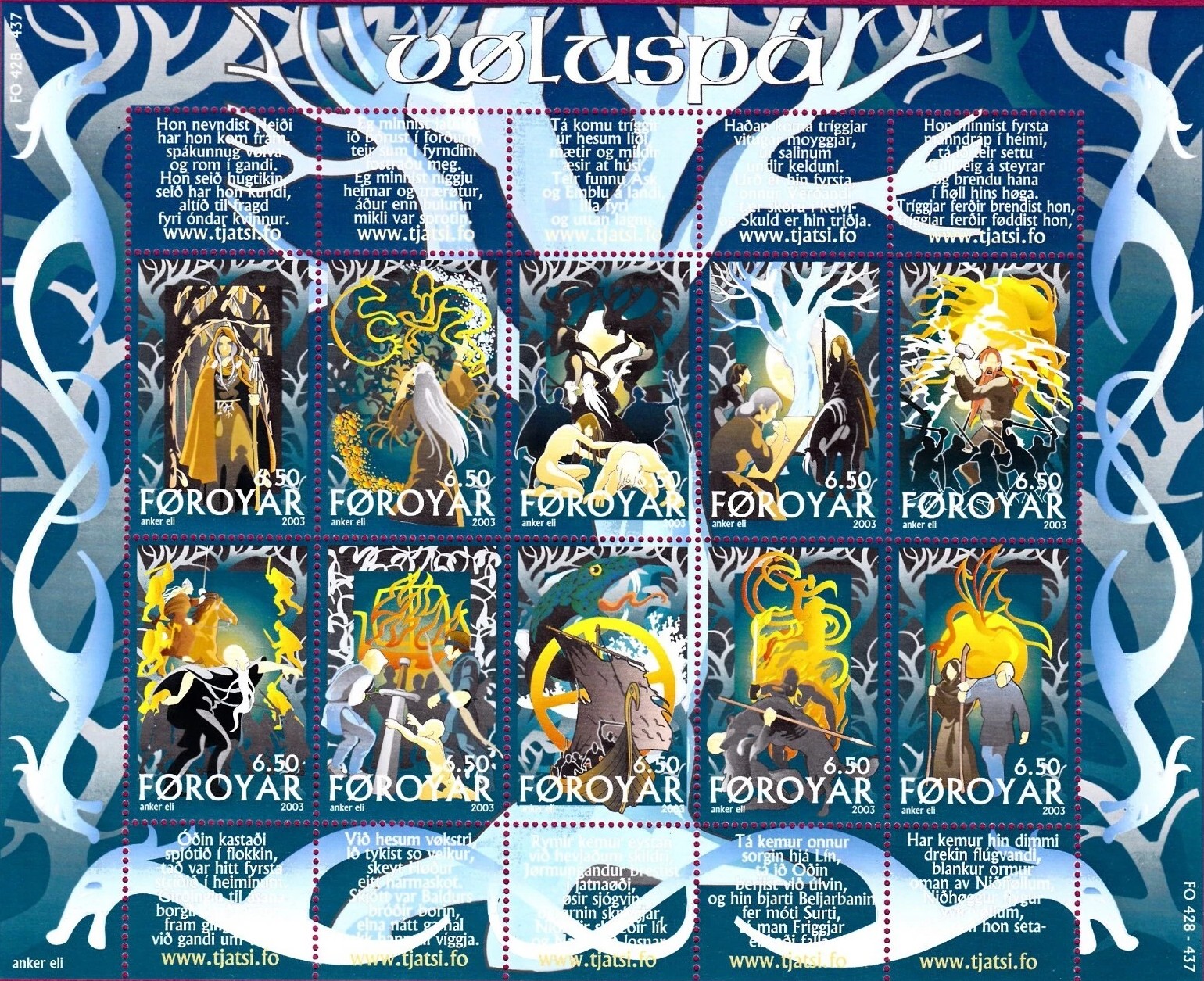 This Faroese stamp sheet illustrates the mythic cycle described in Völuspá.